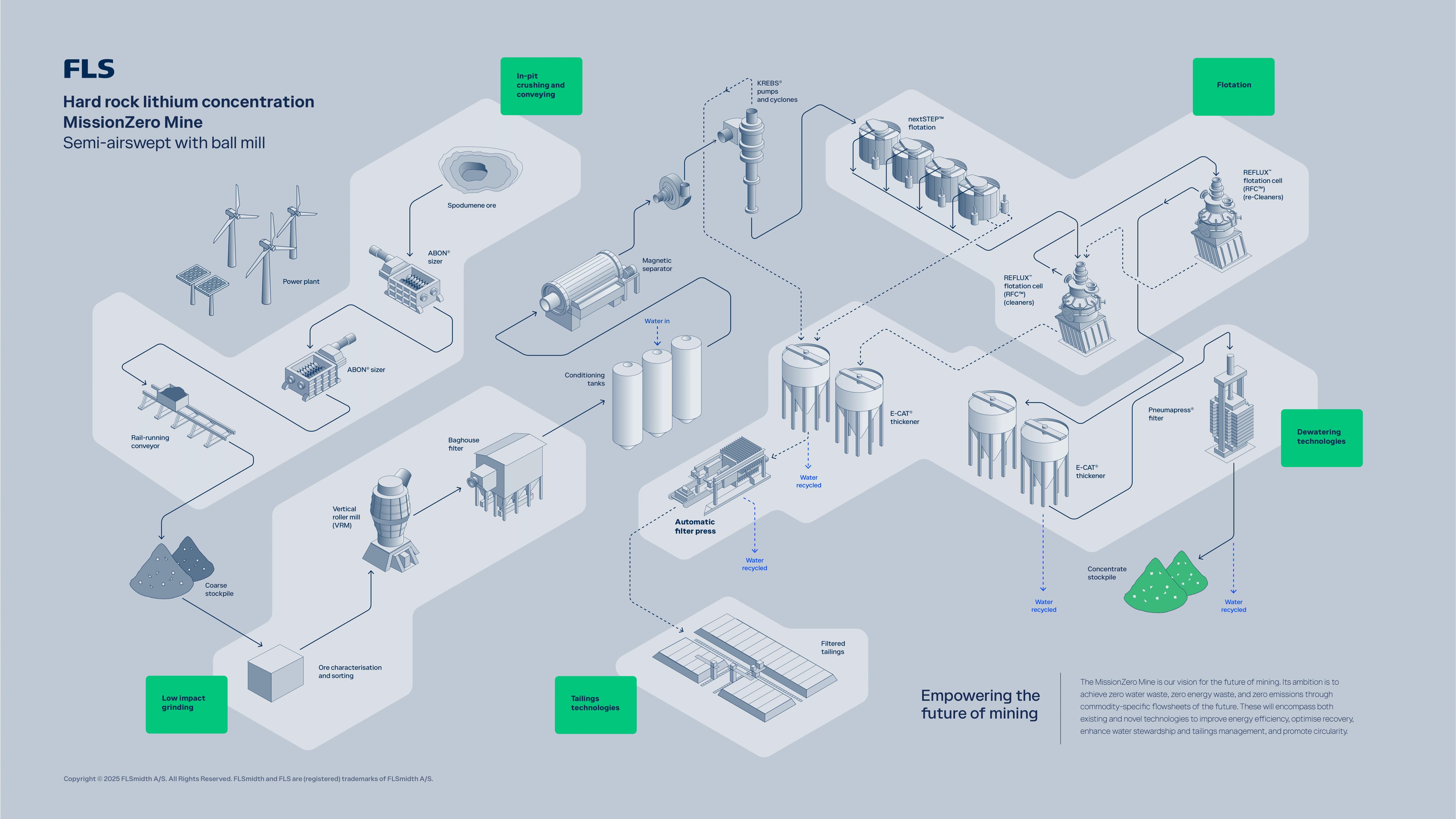 The MissionZero Mine hard rock lithium (spodumene) flowsheet builds on conventional whole-ore flotation circuits by incorporating various innovative technologies in the layout. Spodumene ore is crushed using ABON® Sizers before being sent for ore characterisation and sorting ahead of grinding in an FLS VRM. From the mill, material moves through a magnetic separation step and onto flotation using nextSTEP™ and REFLUX™ flotation cells. Both tailings and concentrates are thickened using E-Cat high-rate thickeners. The spodumene concentrate is then dewatered in a Pneumapress filter, while the tailings are dewatered using an AFP automatic filter press, generating a filtered tailings product.
