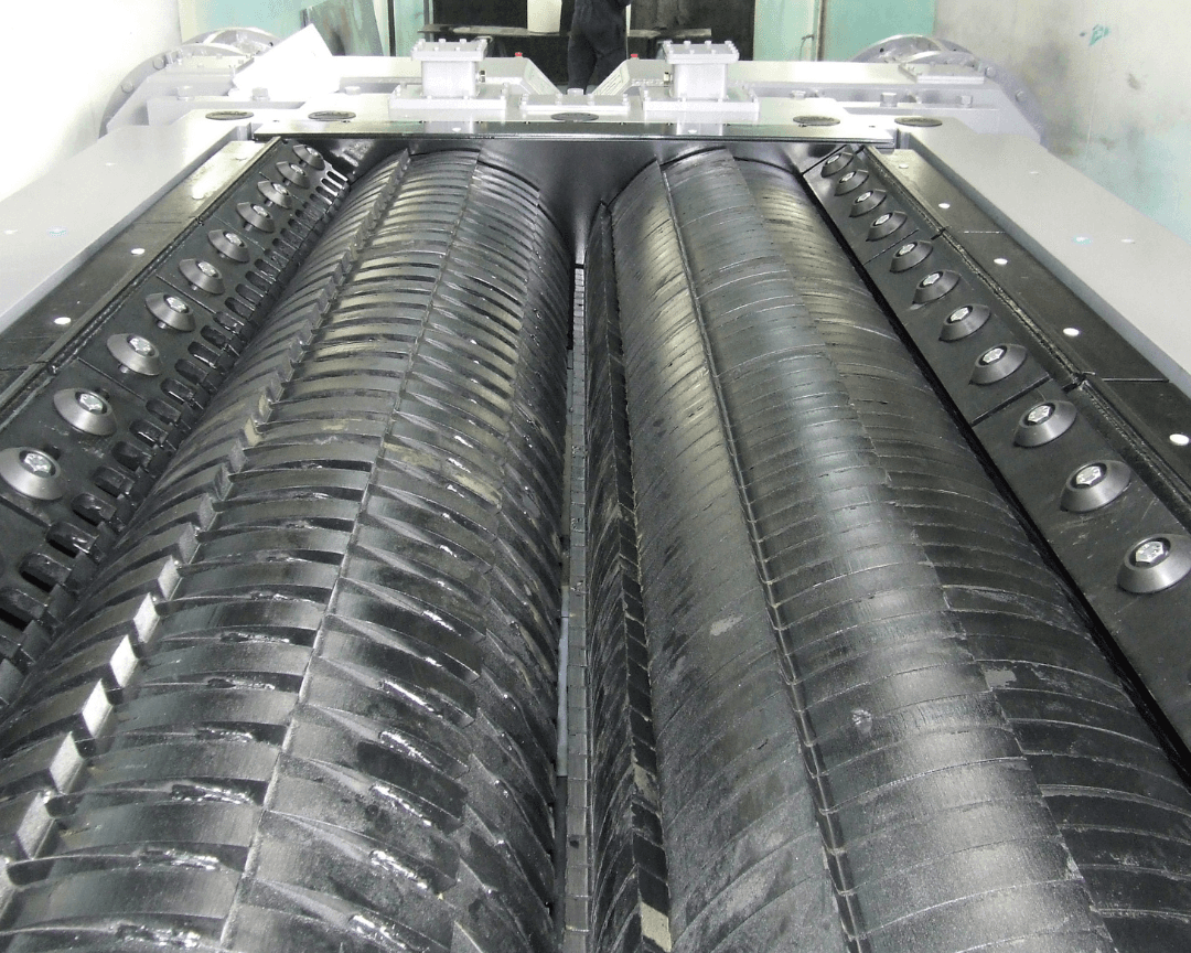 The crushing combs are arranged laterally and have an especially high wear volume. In case of wear, they are repeatedly re-adjustable from outside and in case one side wears out completely, they can be turned to use the second side. Due to their high wear volume, we achieve a long service life with low maintenance and spare parts requirements. Both rolls are equipped with replaceable crushing segments. These crushing segments are available for various applications in different variants and are quickly exchangeable.