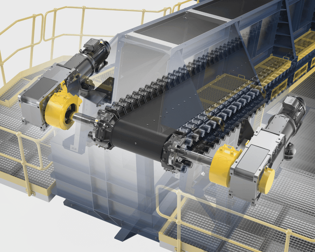 The hybrid apron belt feeder’s heavy-duty construction incorporates conventional conveyor belting, which is bolted to aprons pans. The chain design features double-mounting flanges for effective load distribution while dual carry rollers per chain link ensure low rolling resistance and effective support of the flight bar system. Combined with a reinforced loading deck, bumper flight support bar to absorb loading forces, and robust apron flights, HAB feeders are built to withstand large impact loading forces over long periods of operation.