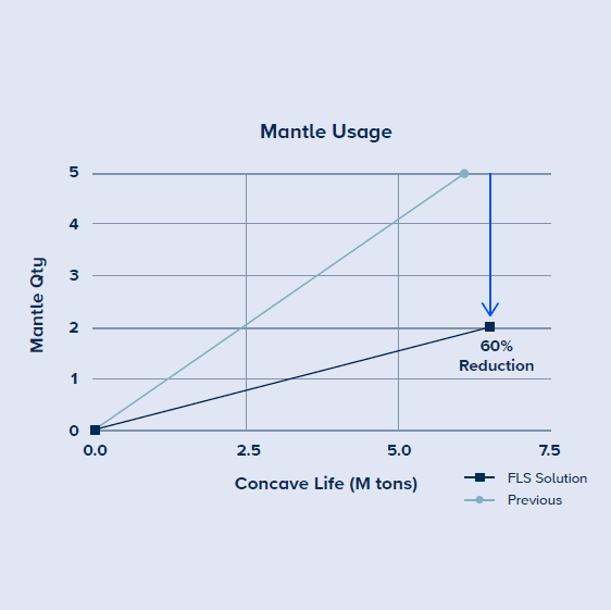 When visiting the site, the FLS team discovered that the crusher feed contained a very high percentage of fines, which intensified wear. The liners would lose the crusher OSS Setting very quickly, and consequently, each concave campaign required an average of five sets of mantles. Site was purchasing their liners from a 3rd party company, who was not able to provide an optimal solution to the ever-increasing cost of maintenance and parts and subsequently reached out to FLS to review their operation.